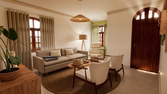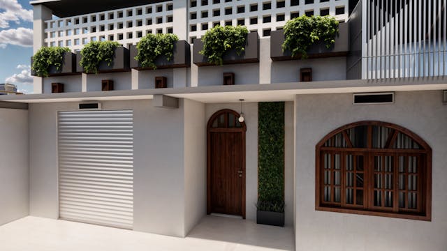 Para esta fachada e hall de entrada foi adotado um estilo boho vibrante, misturado com elementos de design biofílico para proporcionar um ambiente único, acolhedor e sustentável. A proposta integra natureza e arquitetura, criando um espaço funcional e esteticamente agradável, ao mesmo tempo em que reflete a brasilidade e o gosto da cliente.