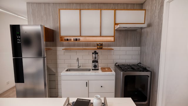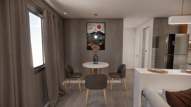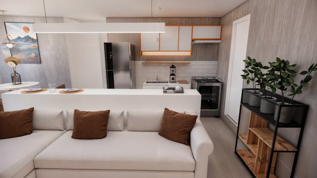 A proposta contempla a integração da cozinha com a sala de estar e jantar, criando um ambiente aberto e acolhedor, ideal para quem gosta de receber amigos. Esse conceito aberto favorece a interação social e amplia a sensação de espaço em um apartamento compacto. Para equilibrar o pedido da cliente pelo uso de cimento queimado, foram escolhidos elementos em branco, evitando que o ambiente ficasse escuro e mantendo uma atmosfera leve e moderna.