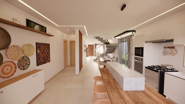 O projeto contempla uma casa de dois pavimentos com uma planta que favorece a conexão linear entre a entrada principal e a área gourmet no fundo do terreno. Esse layout contínuo integra sala de estar, sala de jantar e cozinha, facilitando a ventilação cruzada e permitindo um fluxo livre e sem obstáculos. A paleta de cores neutras e claras foi escolhida para ampliar a sensação de espaço e luminosidade.